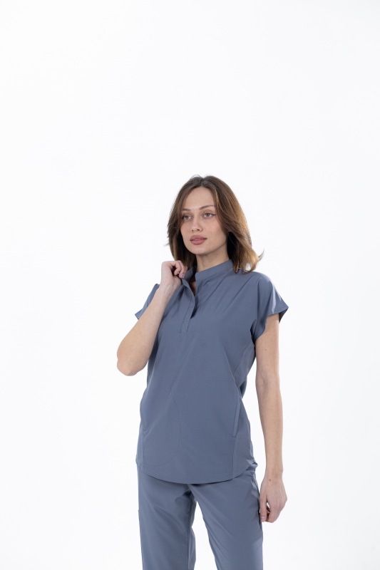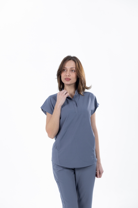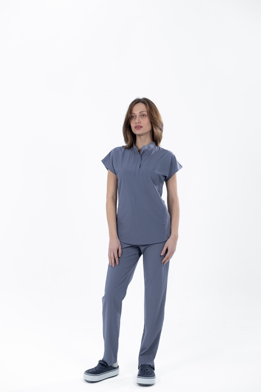 Rəng/Model - Dik yaxa, boz rəng. Önündə və şalvarında geniş cib, rezinli şalvar beli.