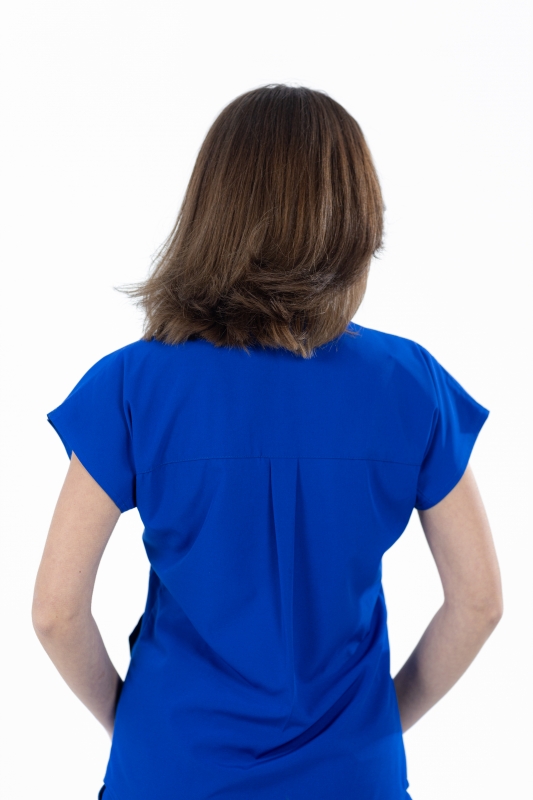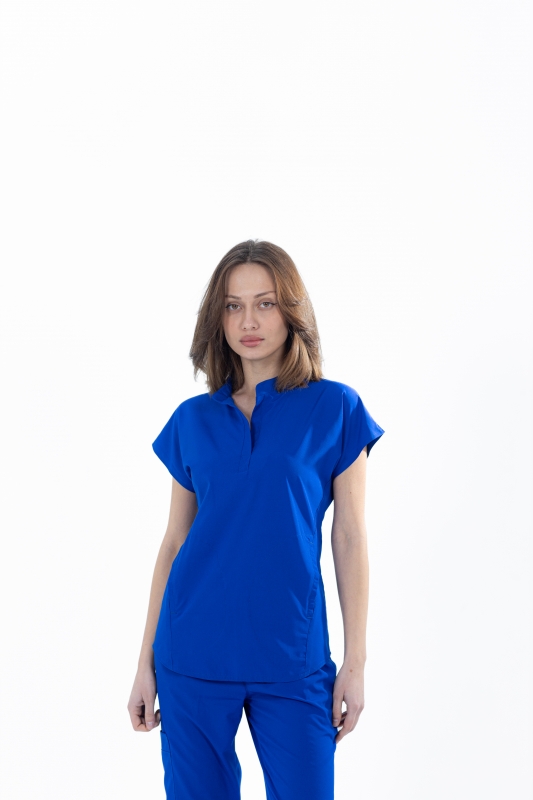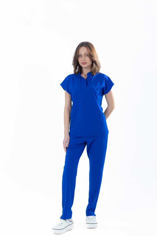 Rəng/Model - Dik yaxa, göy rəng. Önündə və şalvarında geniş cib, rezinli şalvar beli.