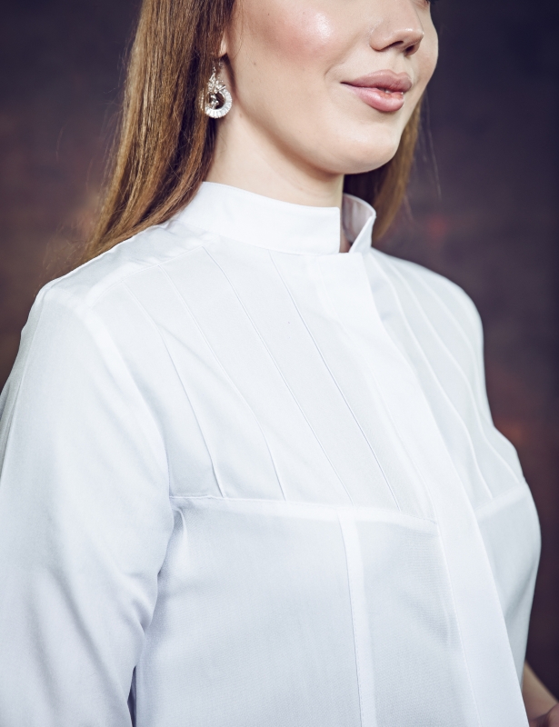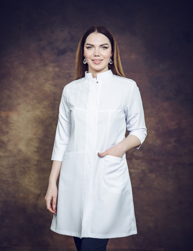 "Klassik ağ xalatın sadəliyini usta işçiliyi ilə birləşdirdik. Sinə hissəsindəki xüsusi 'qatlama' detalları ilə bu model, tibbi geyimdə fərqli tekstura və zəriflik axtaran xanımlar üçün ideal seçimdir. Həm modern, həm də olduqca ciddi görünüş bəxş edən bu kəsim, sizin peşəkar imicinizə özəl bir imza atacaq."